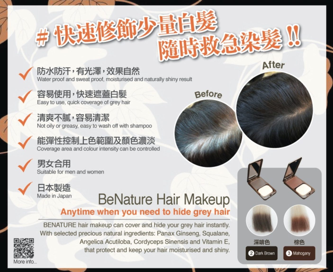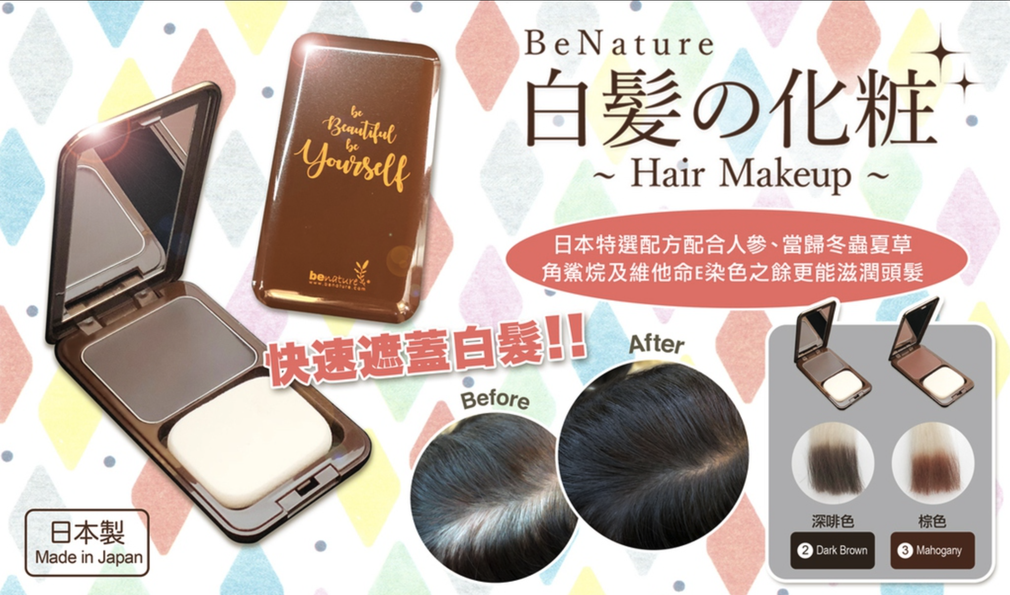 BeNature 白髮化妝染髮粉餅(啡棕色) 快速遮蓋白髮 – 自然上色、輕巧便攜、不沾黏、不掉色、溫和配方,日本製造,安全耐用 💚 簡介 BeNature 白髮化妝染髮粉餅 採用植物精華與護髮成分,能快速遮蓋白髮,提供自然深啡色效果。內含 高麗人參、當歸、蟲草萃取,呵護頭皮與髮絲,使染色同時養護。日本製造,品質保證,安全耐用,輕巧便攜,適合隨時補色,防水防汗,不易脫色,保持全天完美髮色。特別適用於少量白髮遮蓋,輕鬆修飾髮際線與分線處的白髮,打造均勻髮色。 🌿 產品特點 & 主要成分 ✔ 即時遮蓋白髮,效果自然 – 輕輕一刷,髮色自然融入,無粉感、不結塊。 ✔ 適用於少量白髮 – 針對零星白髮、髮際線及分線白髮,輕鬆修飾。 ✔ 植物養護,溫和不傷髮 – 高麗人參萃取 & 當歸萃取,滋養髮絲,減少乾燥。 ✔ 輕盈不沾黏,舒適持久 – 角鯊烯 & 維生素E,提升服貼度,全天不黏膩、不掉色。 ✔ 防水防汗,全天持色 – 耐水耐油,不易脫色。 ✔ 輕巧便攜,隨時補色 – 內附鏡子與粉撲,方便外出隨時使用。 ✔ 日本製造,安全耐用 – 品質可靠,使用安心。 💡 使用方法 1️⃣ 乾髮時使用,用粉撲或刷具沾取適量粉餅。 2️⃣ 輕輕按壓或刷於白髮區域,直至顏色均勻。 3️⃣ 可重複疊加,增強遮蓋效果。 ✅ 適用對象 ✔ 少量白髮遮蓋 – 針對零星白髮、髮際線及分線白髮修飾。 ✔ 快速修飾白髮 – 適合臨時遮蓋白髮,打造自然均勻髮色。 ✔ 不想長期染髮 – 無需化學染劑,隨時輕鬆補色。 ✔ 易敏感頭皮 – 溫和植物配方,減少頭皮負擔。 ✔ 日常外出補色 – 方便攜帶,隨時修飾,保持完美髮色。