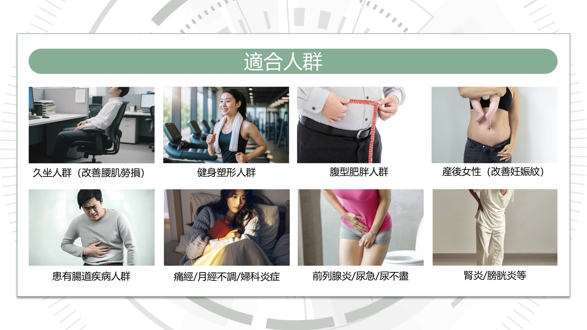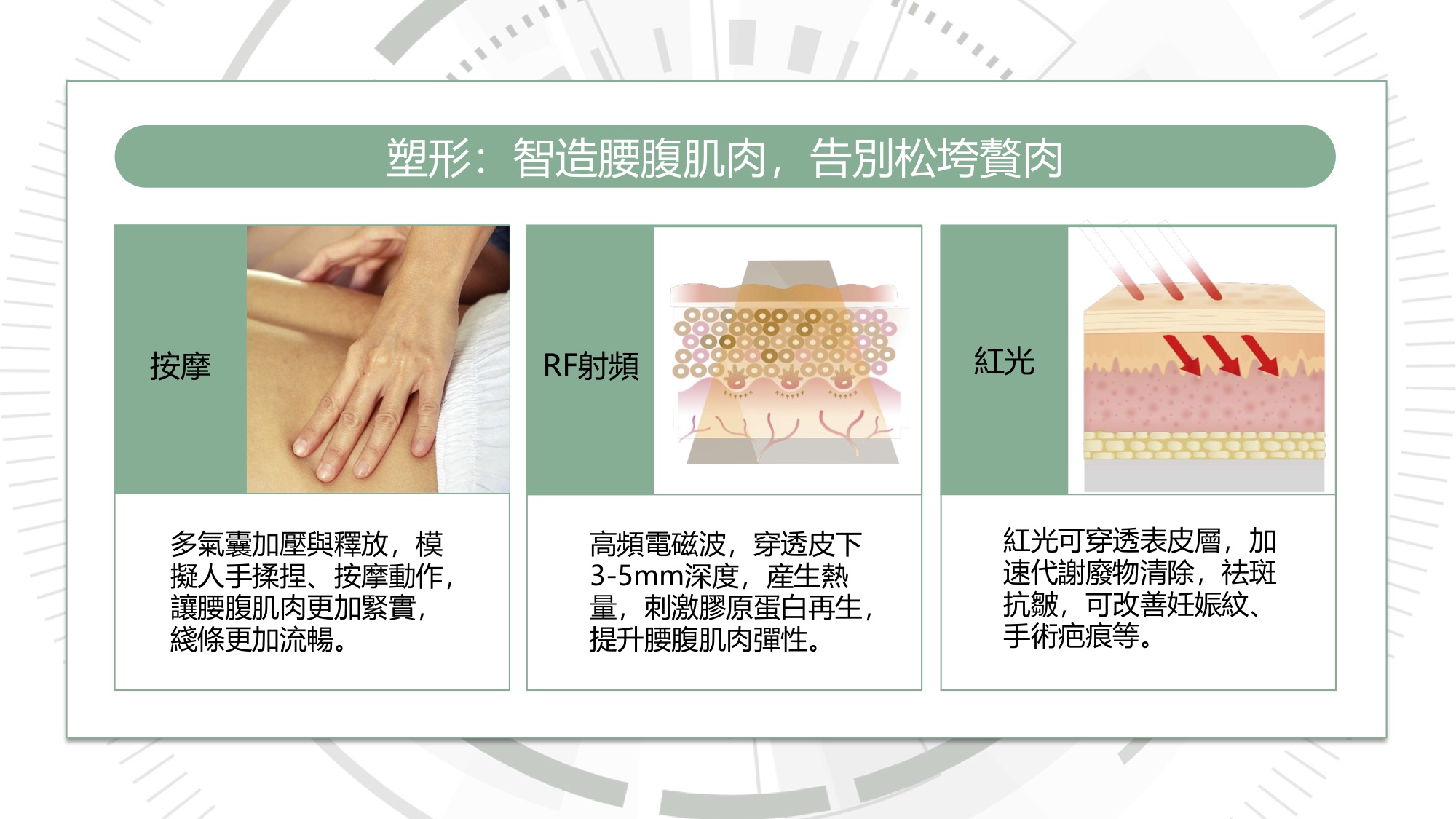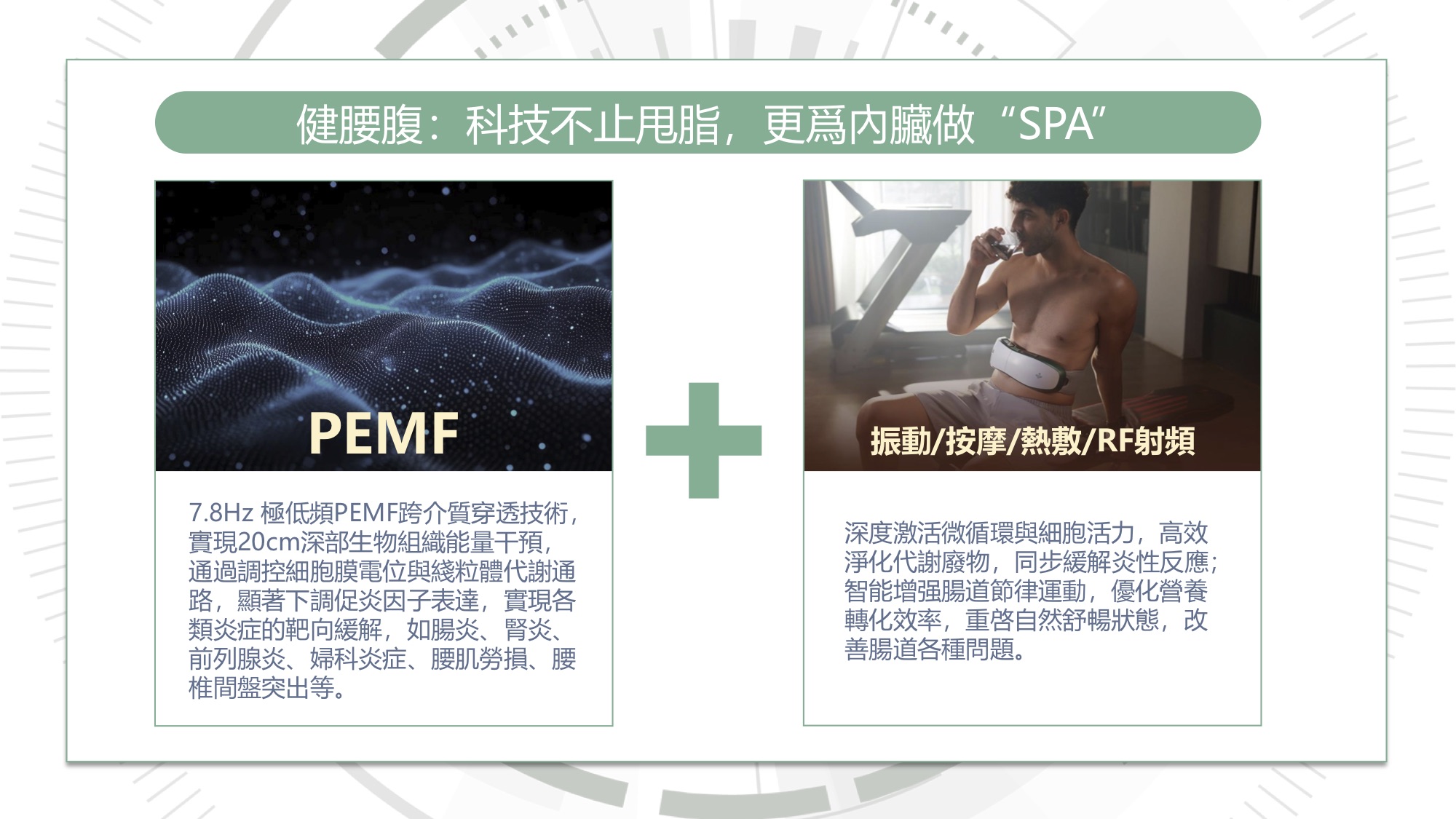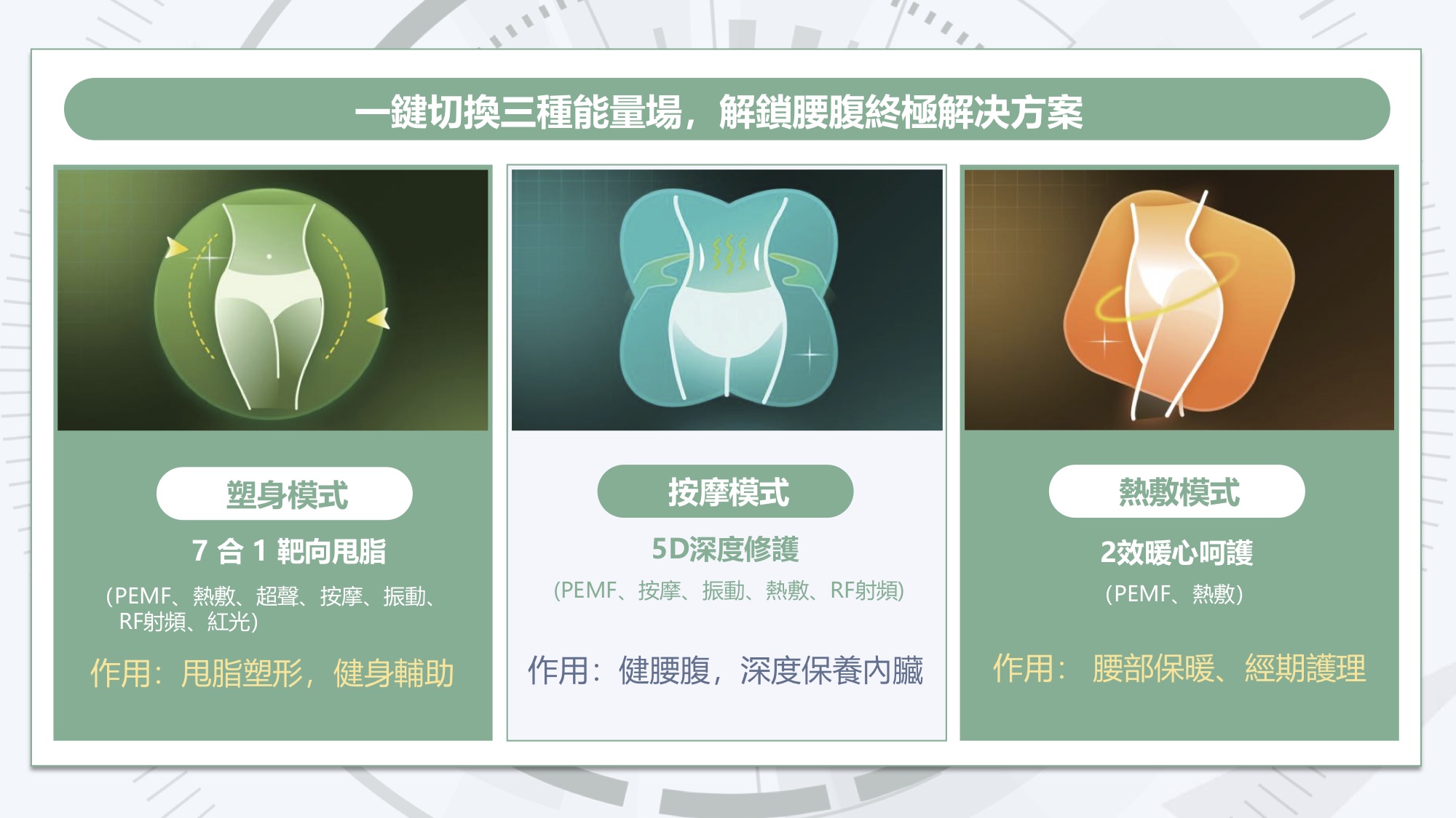 超聲波深入10-20mm皮下脂質層靶向瓦解頑固脂肪;PEMF穿透20cm深達內臟,調控細胞膜電位、抑制炎症因子,同步改善腸道、婦科、前列腺等問題;RF射頻+紅光刺激膠原新生,淡化妊娠紋與疤痕。