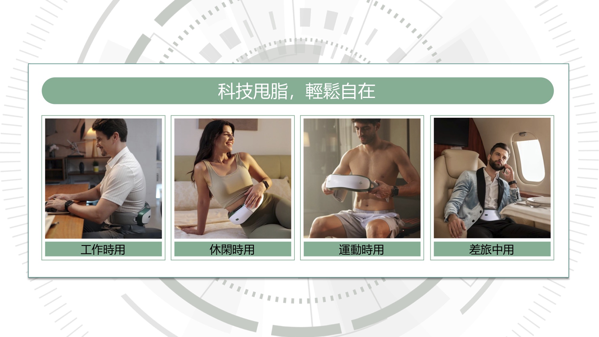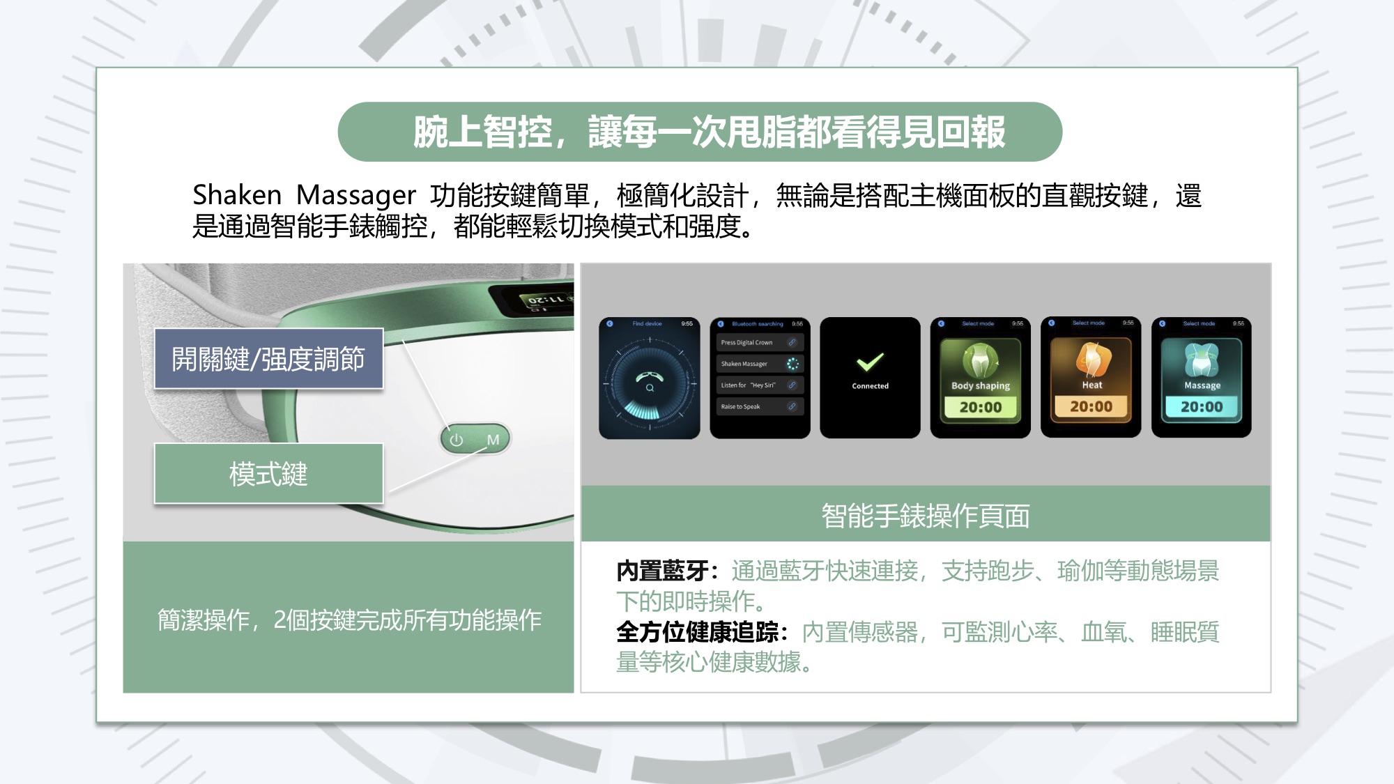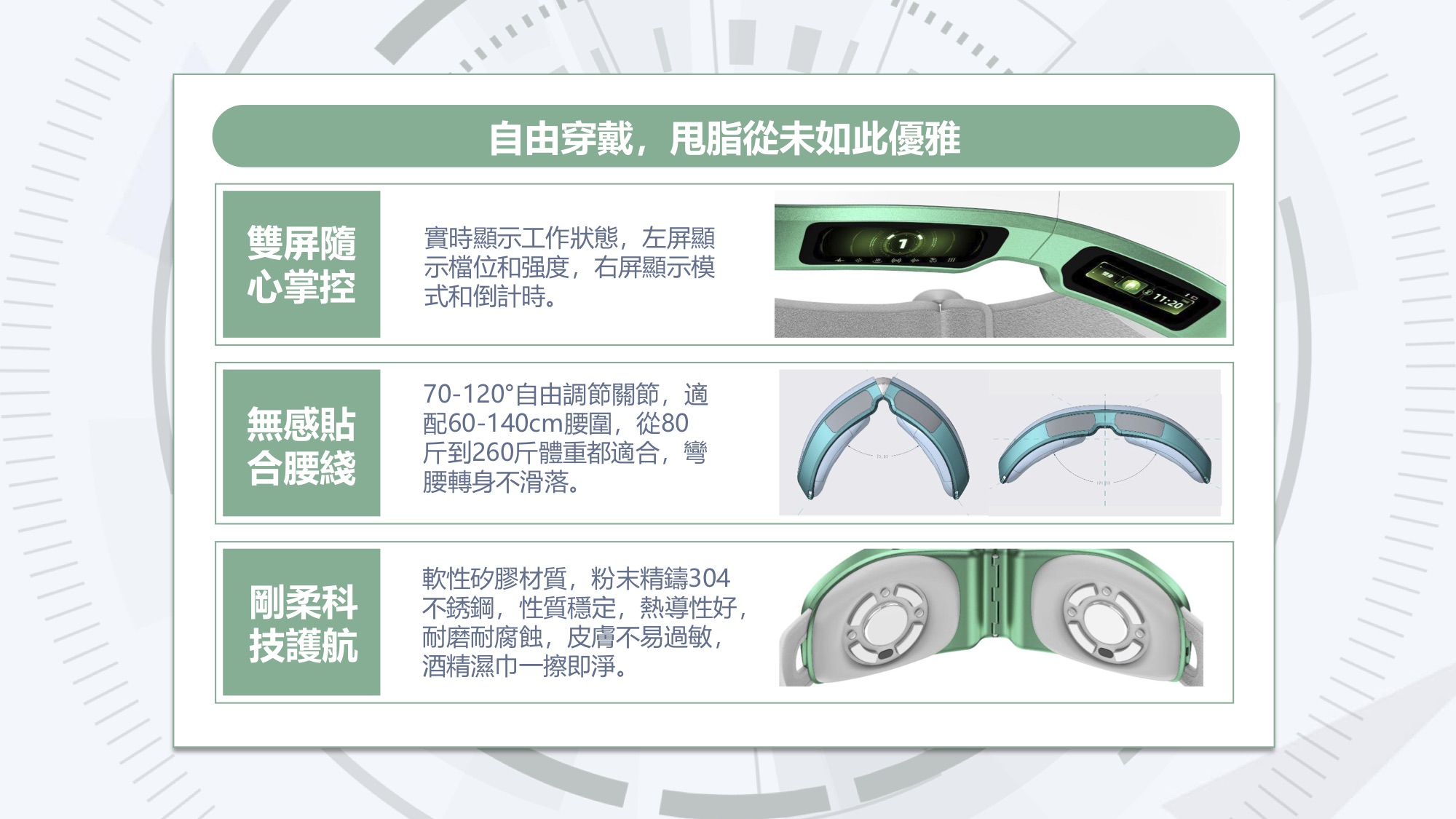 一鍵切換塑身(7合1甩脂)、按摩(5D深度修護)、熱敷(暖宮護腰)三種模式;70-120°可調關節完美貼合60-140cm腰圍,80-260斤皆適用;雙屏+智能手錶藍牙遙控,實時監測心率血氧;矽膠+304不鏽鋼材質,久戴無感不滑落。
