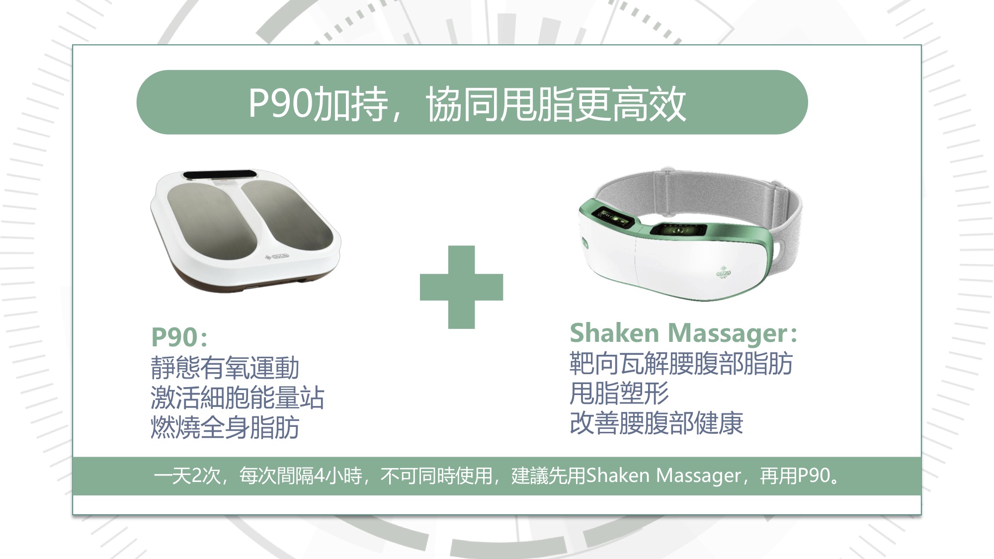 每日2次,每次間隔4小時,搭配P90使用效果加倍。工作、運動、差旅皆可穿戴,甩掉脂肪,自信閃耀每一天。