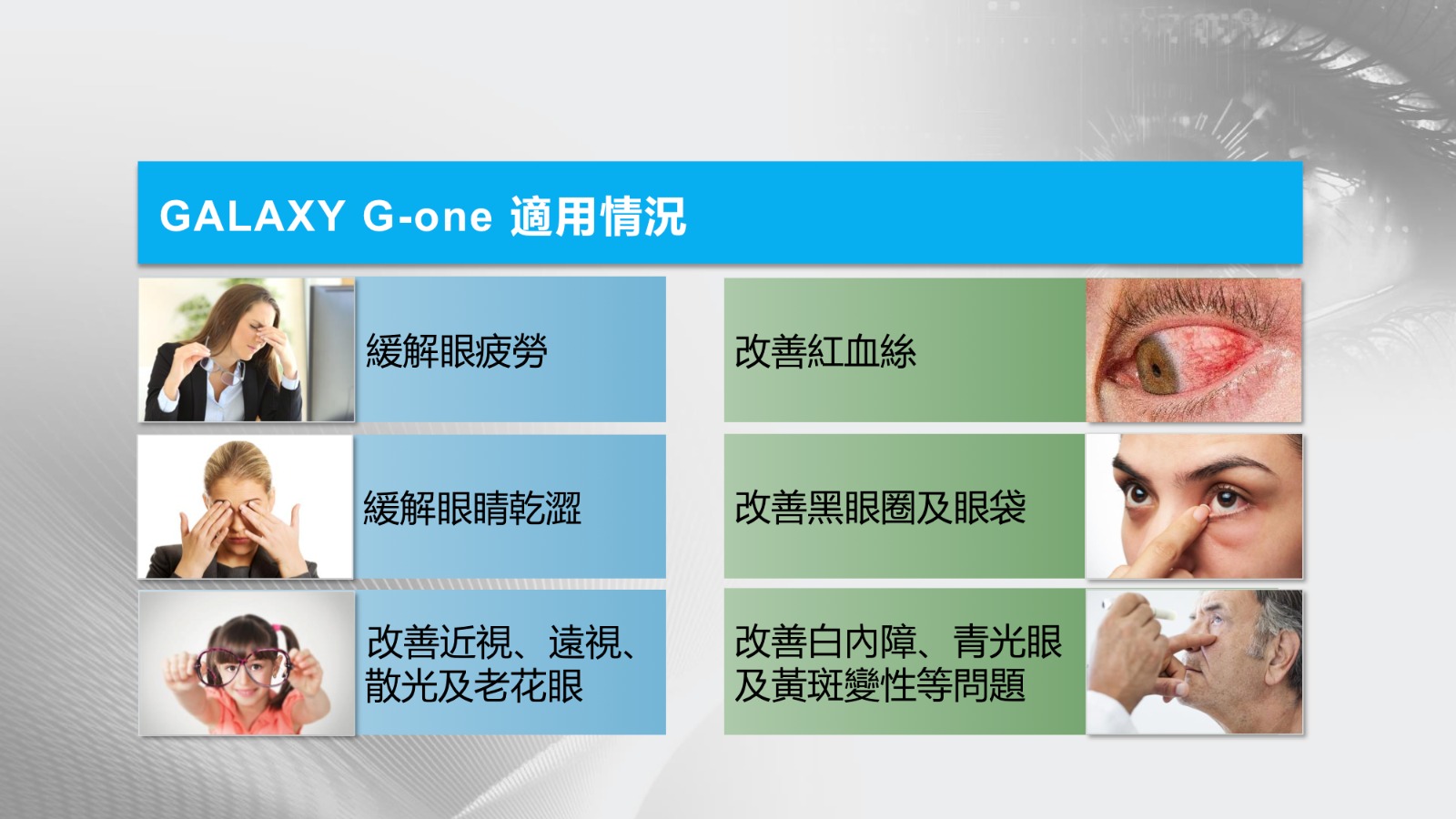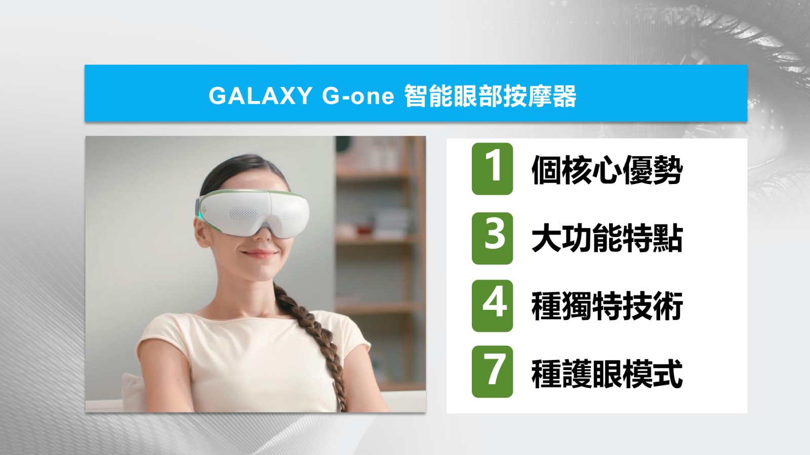 1個核心優勢:PEMF,引領護眼前沿科技 GALAXY G-one 特別搭載了7.8Hz超低頻PEMF (舒曼波),是全球首款低頻PEMF護眼儀。全面 解決眼部的衰老、損傷、炎症、迴圈等問題。 1.啟動眼部細胞改善衰老問題 2.促進眼組織的修復和再生 3.緩解眼部炎症 4.促進眼部血液迴圈